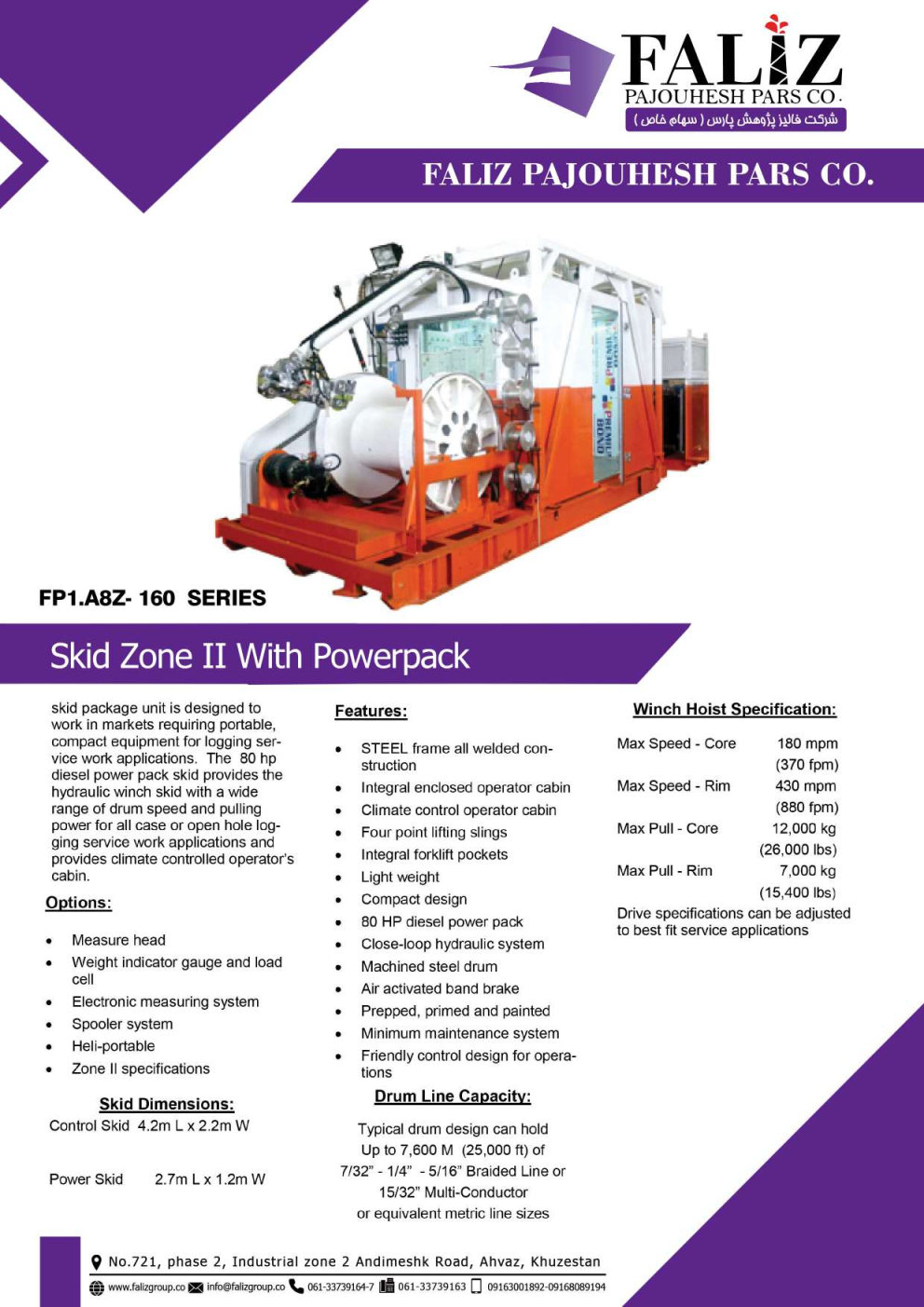 واحد اسکید برای بازارهایی طراحی شده است که نیاز به تجهیزات قابلحمل، کمحجم و ایمن برای عملیات سرویسدهی لاگینگ دارند. پاورپک دیزلی ۸۰ اسب بخار، نیروی هیدرولیکی لازم برای وینچ را با دامنه گستردهای از سرعت درام و نیروی کشش فراهم میکند و برای تمامی کاربردهای لاگینگ در چاههای کیسینگدار یا باز مناسب است. این دستگاه همچنین دارای کابین اپراتور با کنترل شرایط محیطی میباشد.